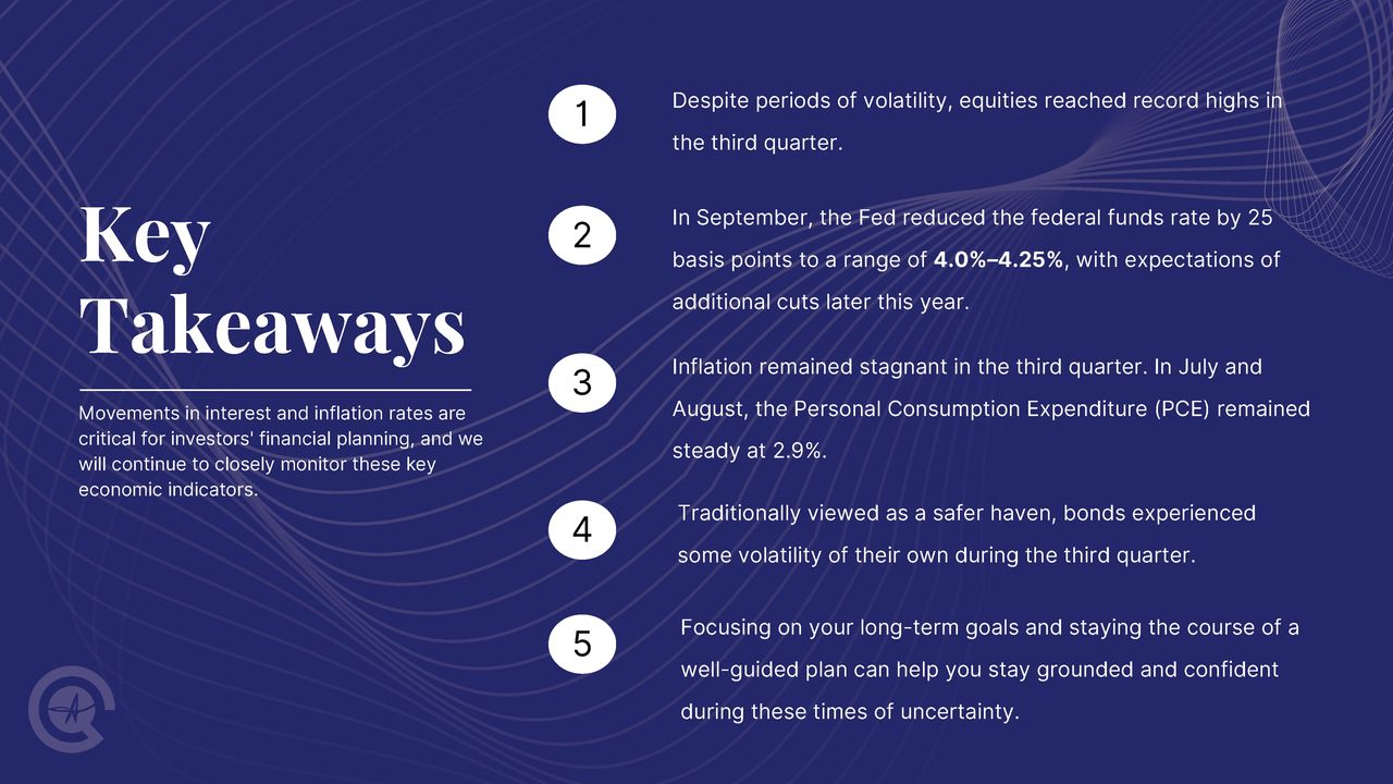 Since the recovery from the quick correction we saw in April, the market has rallied. While investors have a bullish outlook, a backdrop of caution and uncertainty still remains. During the third quarter, the U.S. job market showed signs of cooling but remained strong. While a prolonged government shutdown could increase the unemployment rate in the near future, as of August, the unemployment rate was slightly elevated to 4.3%, the highest in nearly four years. (Source: Bureau of Labor Statistics; 9/5/25)