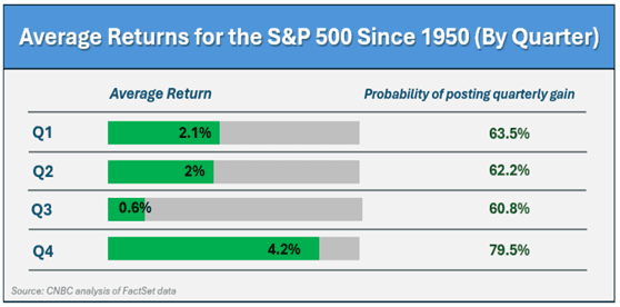 While no one has a crystal ball, and past results do not reflect future ones, it’s interesting to note that based on historical data for the S&P 500 index, the fourth quarter is the strongest-performing quarter for equities. Since 1950, it has delivered the highest average return and the highest probability of posting a gain. (Source: finance.yahoo.com; 9/25/25)