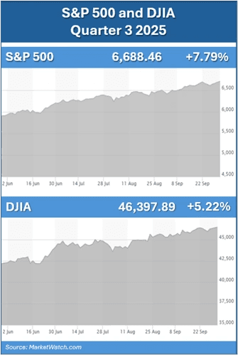 Resilience illustrates the ability to withstand challenges or recover quickly from difficult conditions. Resilience can also be used to describe U.S. equity performance over the past year—including the third quarter, as markets surged past record highs despite numerous potential sources of volatility. Largely fueled by optimistic investor sentiment around the AI boom, robust corporate earnings, and expectations of further interest rate cuts, the U.S. stock market continued its bull run that began in early 2023. The artificial intelligence (AI) boom is continuing to drive growth in the technology sector, dominated by the “Magnificent 7” (Alphabet, Amazon, Apple, Meta, Microsoft, Nvidia, and Tesla). In addition to the AI boom, healthy corporate earnings and the Fed lowering interest rates for the first time this year all helped the market rally. The S&P 500 gained 7.79% in the third quarter, closing at 6,688.46. Year-to-date, as of September 30, the S&P 500 is up almost 14%. The Dow Jones Industrial Average (DJIA) closed at a record high, gained 5.22% and ended the quarter at 46,397.89. Year-to-date, as of September 30, the DJIA is up over 9%.